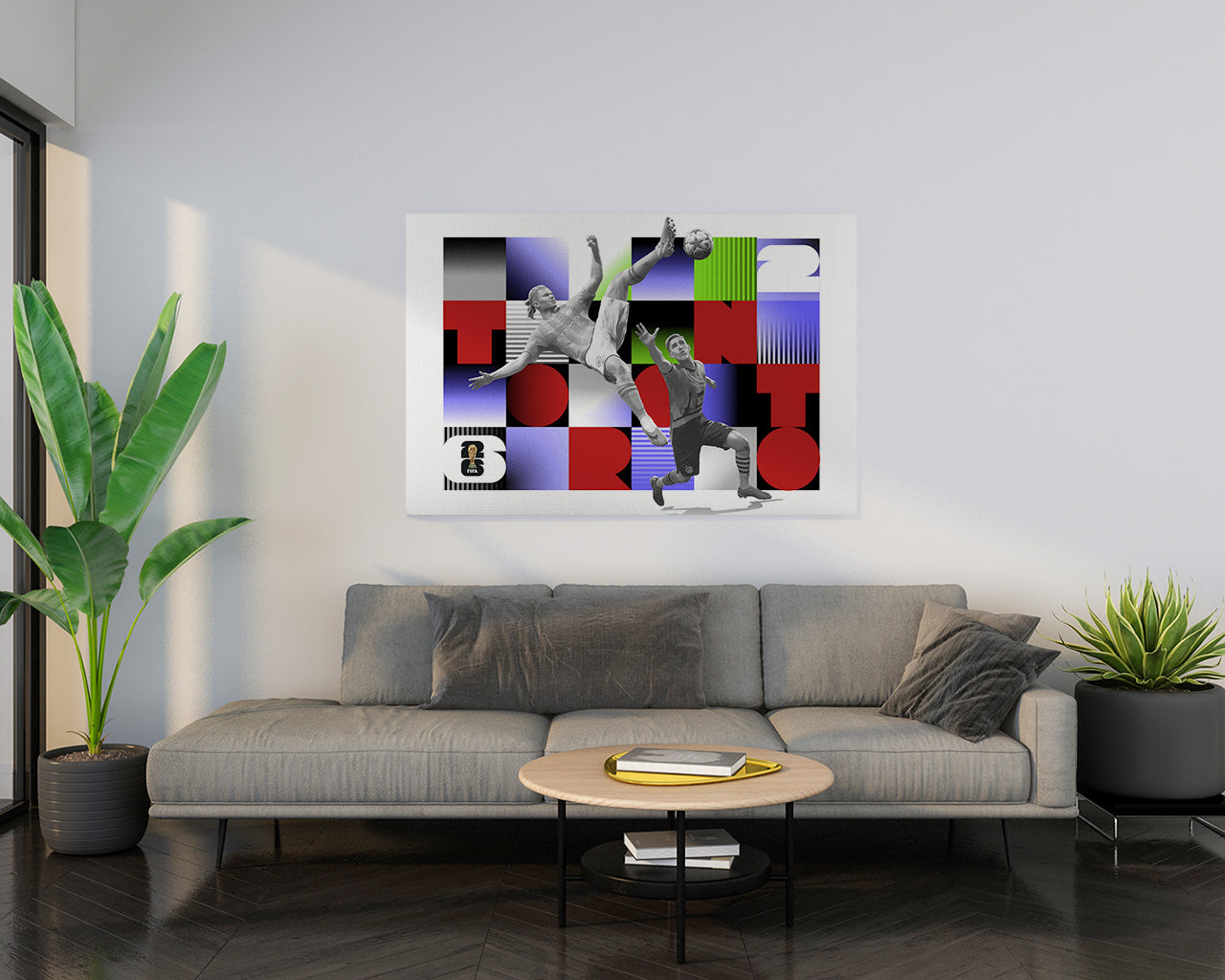 FIFA 2026 - Toronto este un tablou canvas realizat din pânză de bumbac 100%, imprimată cu cerneluri pe bază de latex, înrămată pe un cadru din lemn natural executat manual