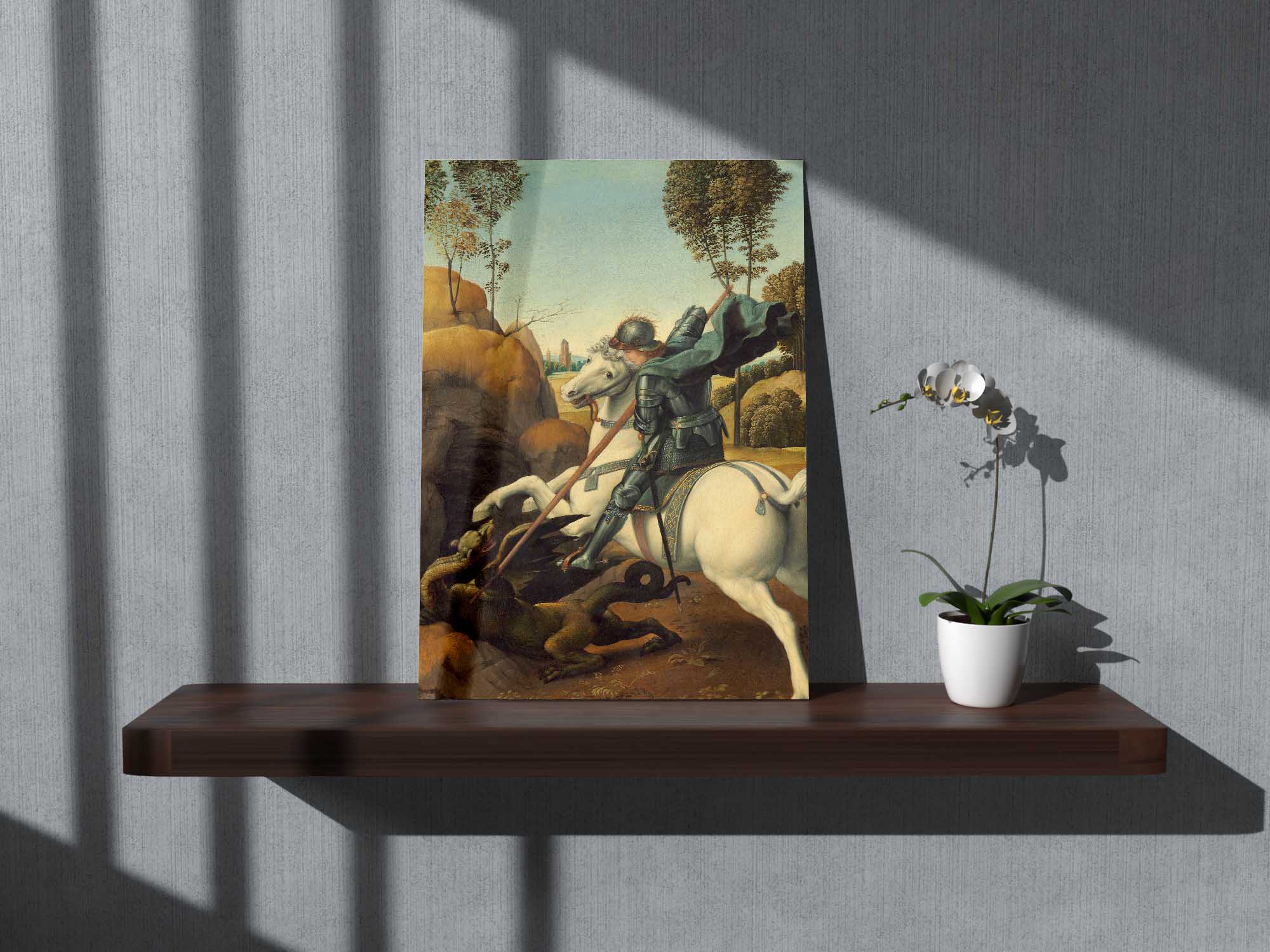 Raphael - Saint George and the Dragon este un tablou canvas realizat din pânză de bumbac 100%, imprimată cu cerneluri pe bază de latex, înrămată pe un cadru din lemn natural executat manual